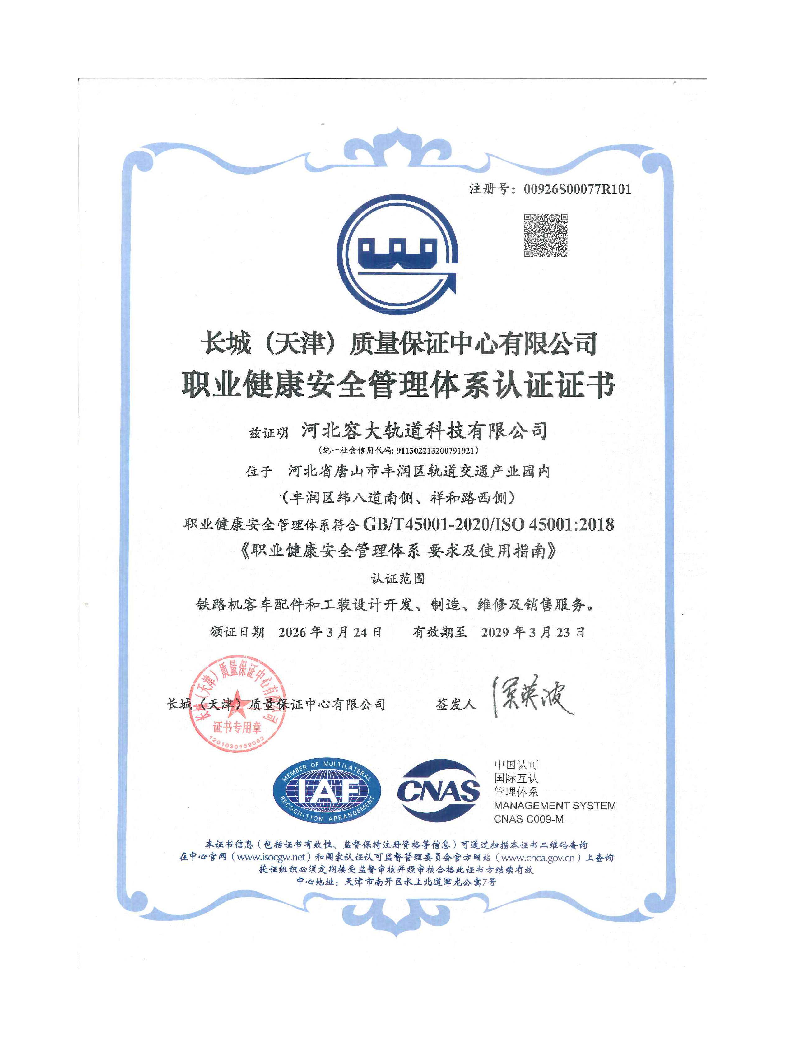 职业健康安全管理体系认证证书